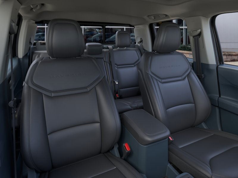 Boasting a bold and distinctive appearance, the Maverick Lariat commands attention with its Black Appearance Package, featuring a sleek black grille, black-painted roof, and 19-inch black-painted aluminum wheels. Step inside and be enveloped in the sophisticated Navy Pier interior, where black accents and premium ActiveX-trimmed heated front bucket seats create an environment of unparalleled comfort and refinement.